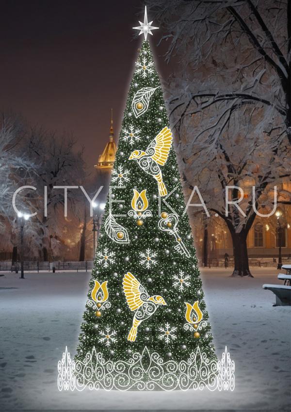 В основе дизайнерской уличной ёлки каркасная Уральская ёлка с хвоей плёнкой.
