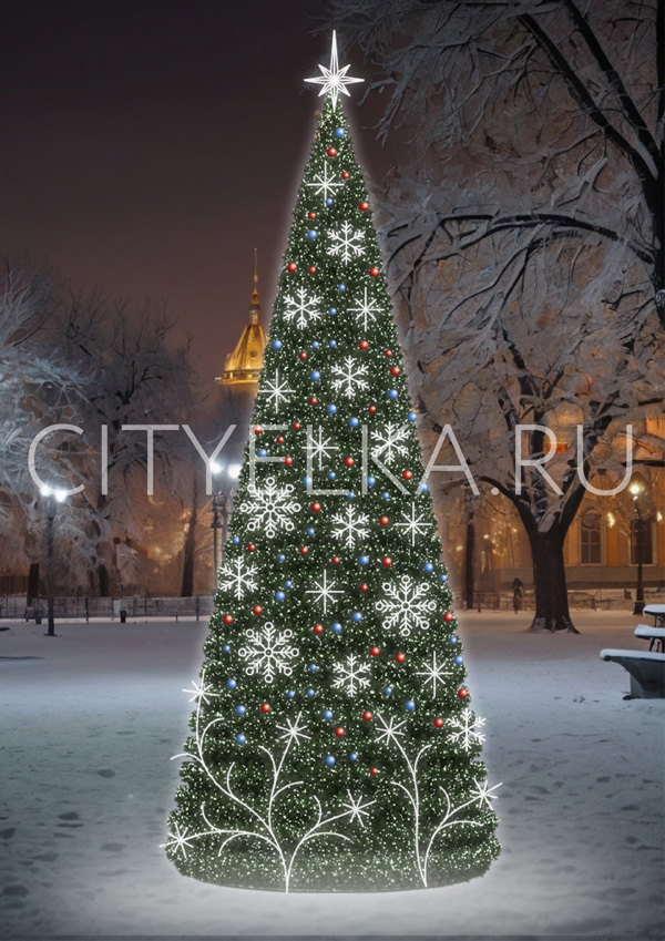 В основе дизайнерской уличной ёлки каркасная Уральская ёлка с хвоей плёнкой.