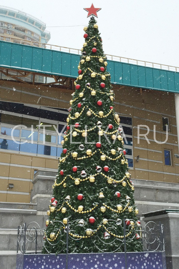 - Ветки начинаются от земли, основание пригружают бетонными блоками. Рекомендуется ставить ёлку на подиум или использовать ограждение.