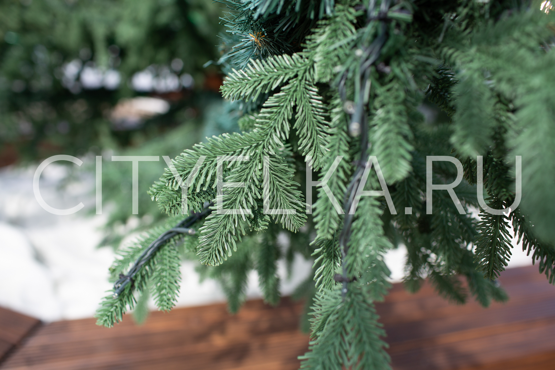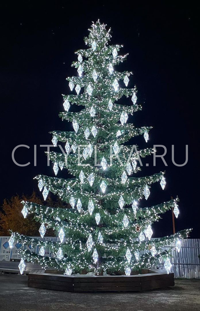 Лесная уличная ёлка - ствольная ёлка с длинными металлическими ветками, на которых крепятся маленькие веточки с литой хвоей. Из-за оригинальной формы веток, на ёлку очень удобно вешать большие удлиненные игрушки - крупные шары, сосульки и т.п.