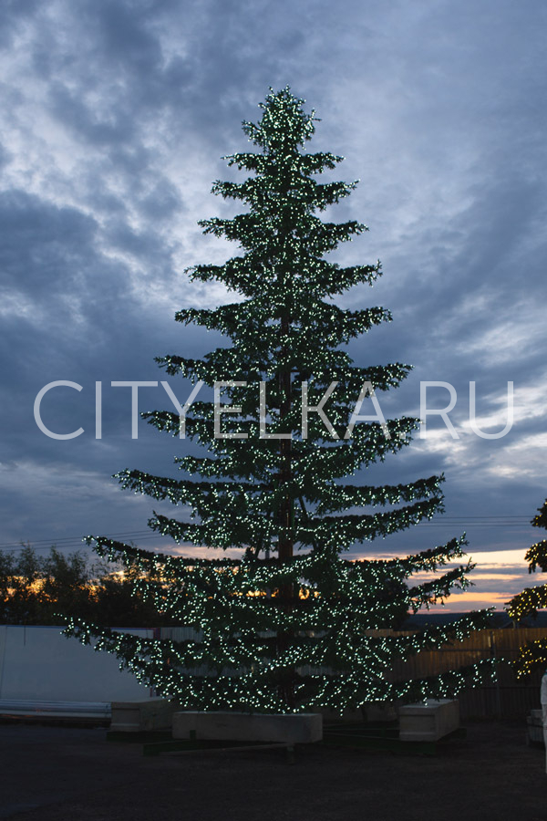 Лесная уличная ёлка - ствольная ёлка с длинными металлическими ветками, на которых крепятся маленькие веточки с литой хвоей. Из-за оригинальной формы веток, на ёлку очень удобно вешать большие удлиненные игрушки - крупные шары, сосульки и т.п.
