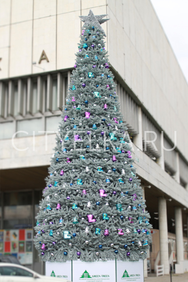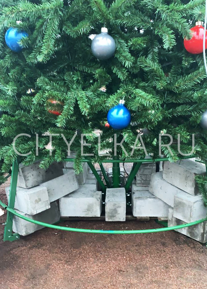 - Ветки начинаются от земли, основание пригружают бетонными блоками. Рекомендуется ставить ёлку на подиум или использовать ограждение.