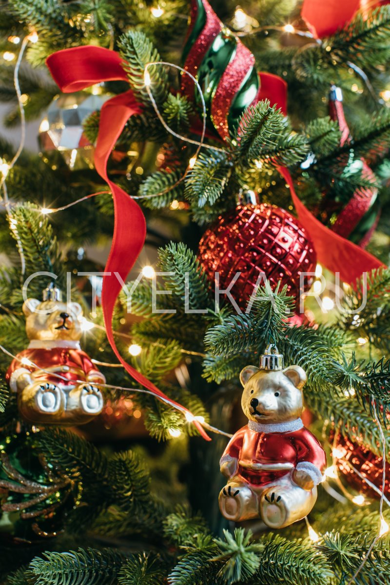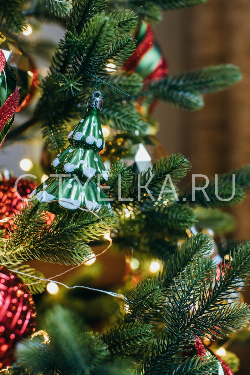 Стильное оформление в традиционных рождественских цветах: красный, зеленый и золото. Игрушки разных форм и текстуры, что делает декор гармоничным и не скучным.