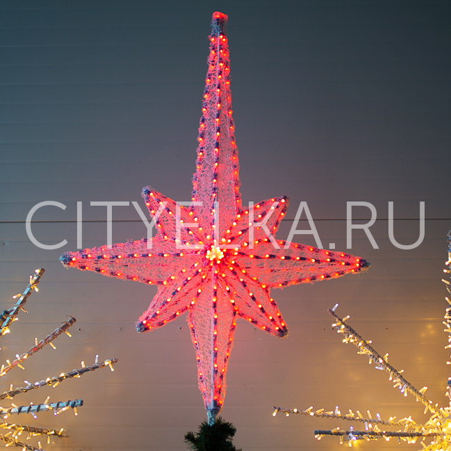 Пластиковый корпус, в который вставлена гирлянда. В дневное время пластиковый цветной корпус хорошо заметен. В комплекте идет контроллер, управляющий свечением макушки - она светится разными цветами: белый, красный, синий.