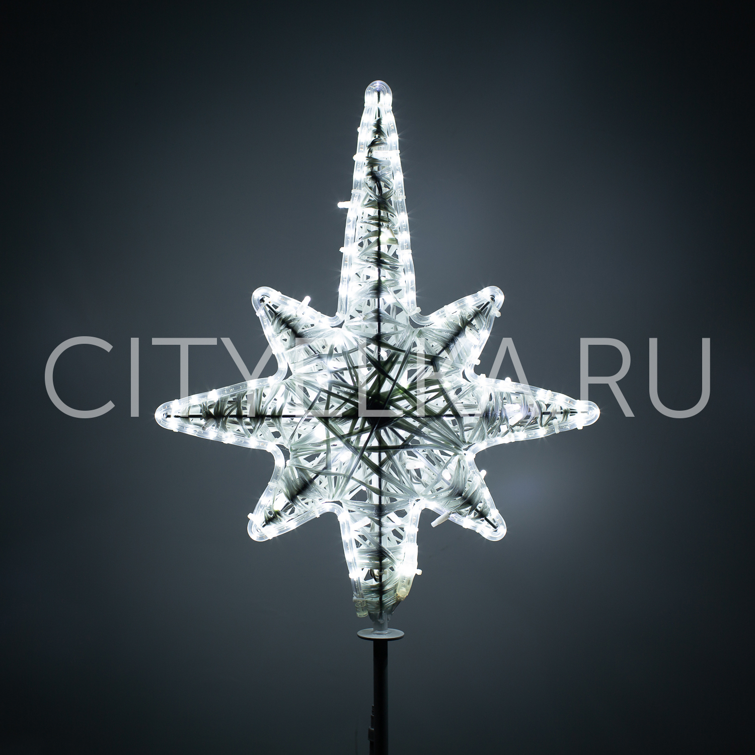 Усовершенствованные макушки для уличных елок Стекло-нить изготавливаются из металлического каркаса, обрамленного  светящимся шнуром дюралайт с внутренним заполнением гирляндой того же цвета.