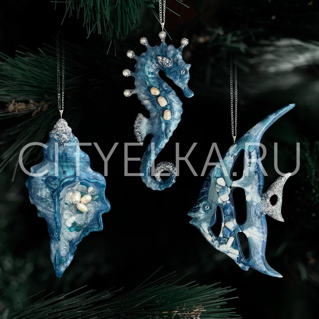 Набор ёлочных игрушек «Тайны океана» приглашает окунуться в мир подводных чудес, где каждая игрушка отражает красоту морской стихии. В коллекцию вошли «Морской конёк», «Ракушка желаний» и «Жемчужная рыбка» — символы таинственного и прекрасного подводного мира. Эти игрушки выполнены из ювелирной смолы и инкрустированы природными минералами.