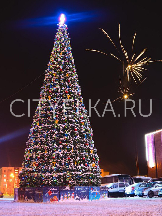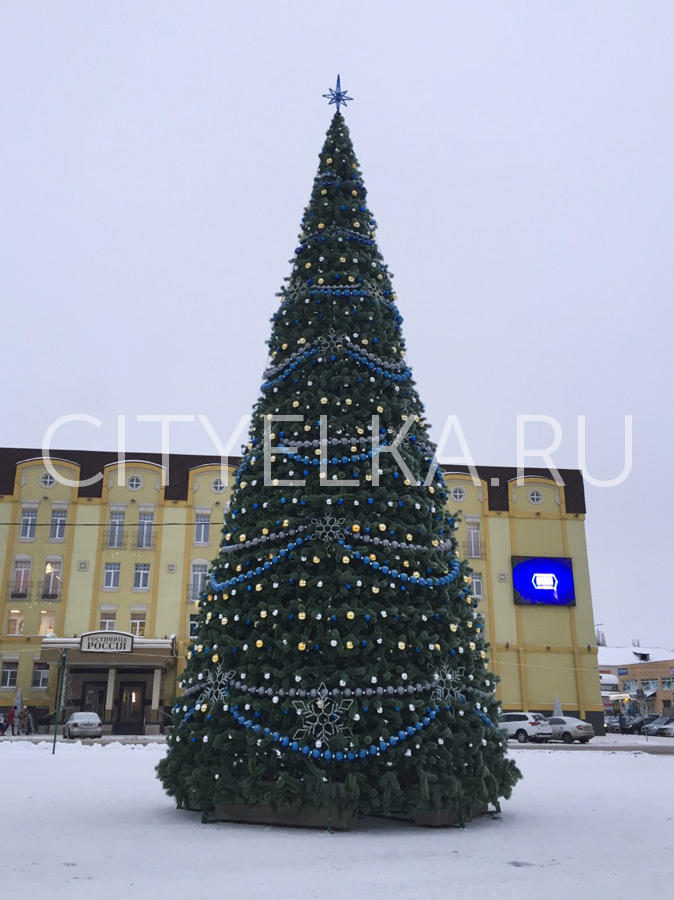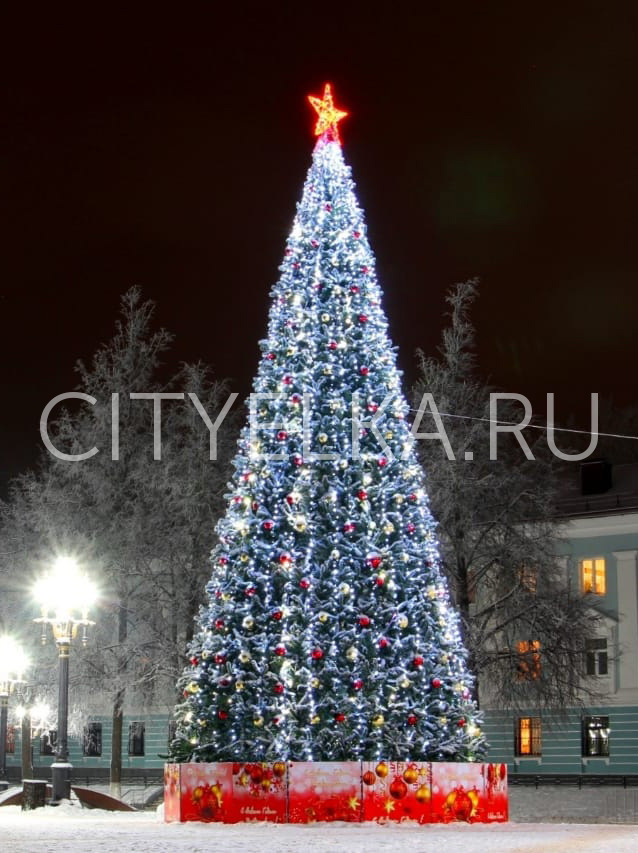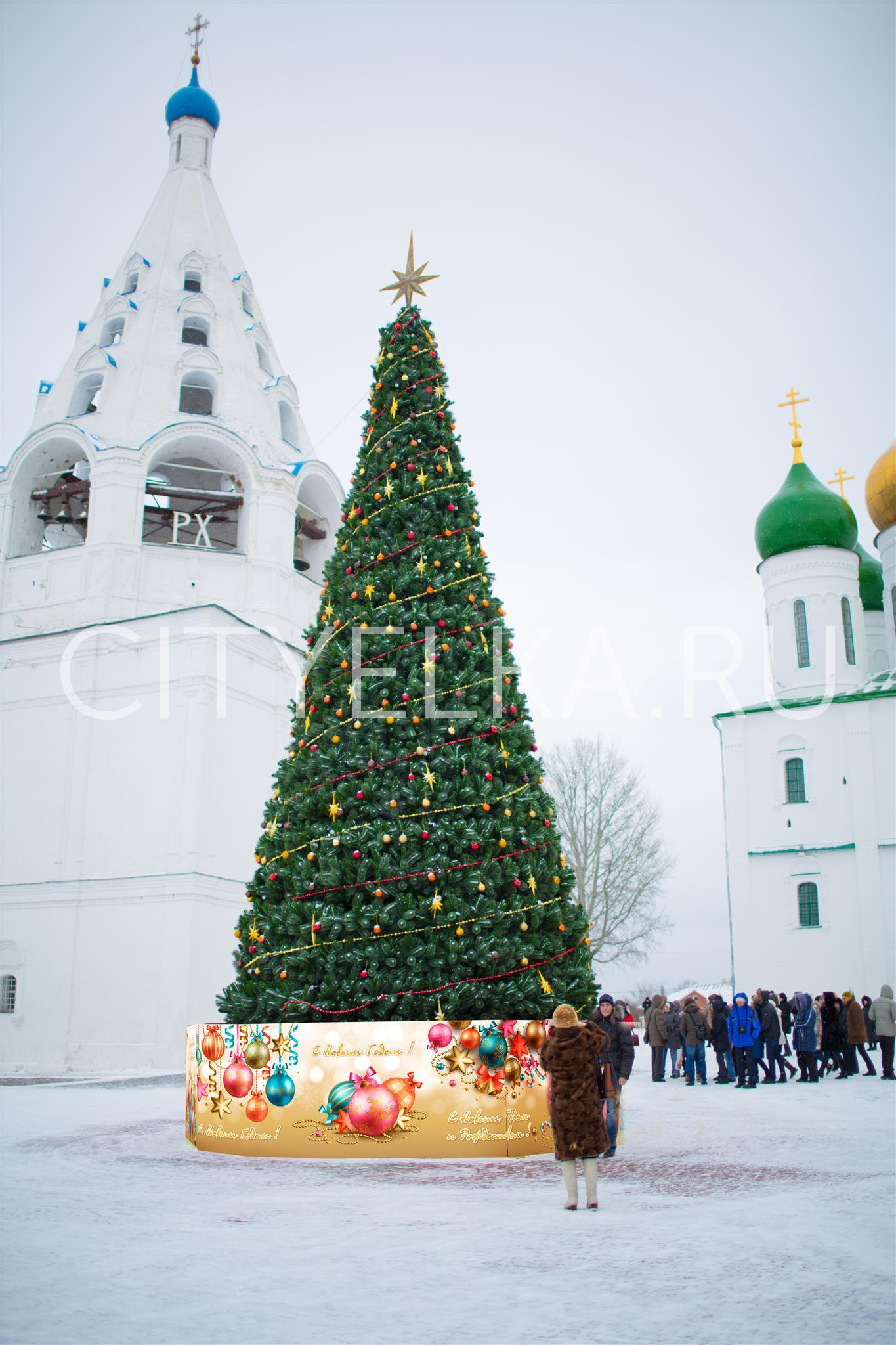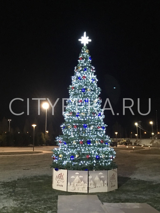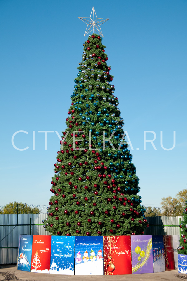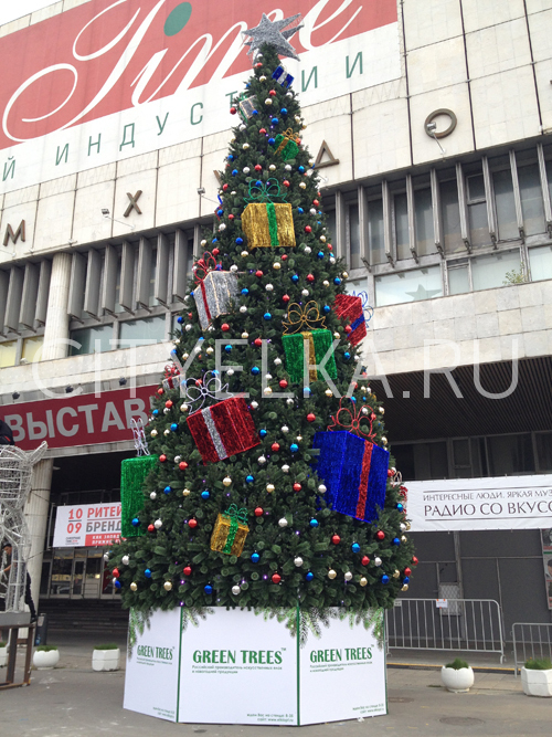 - Ветки начинаются от земли, основание пригружают бетонными блоками. Рекомендуется ставить ёлку на подиум или использовать ограждение.